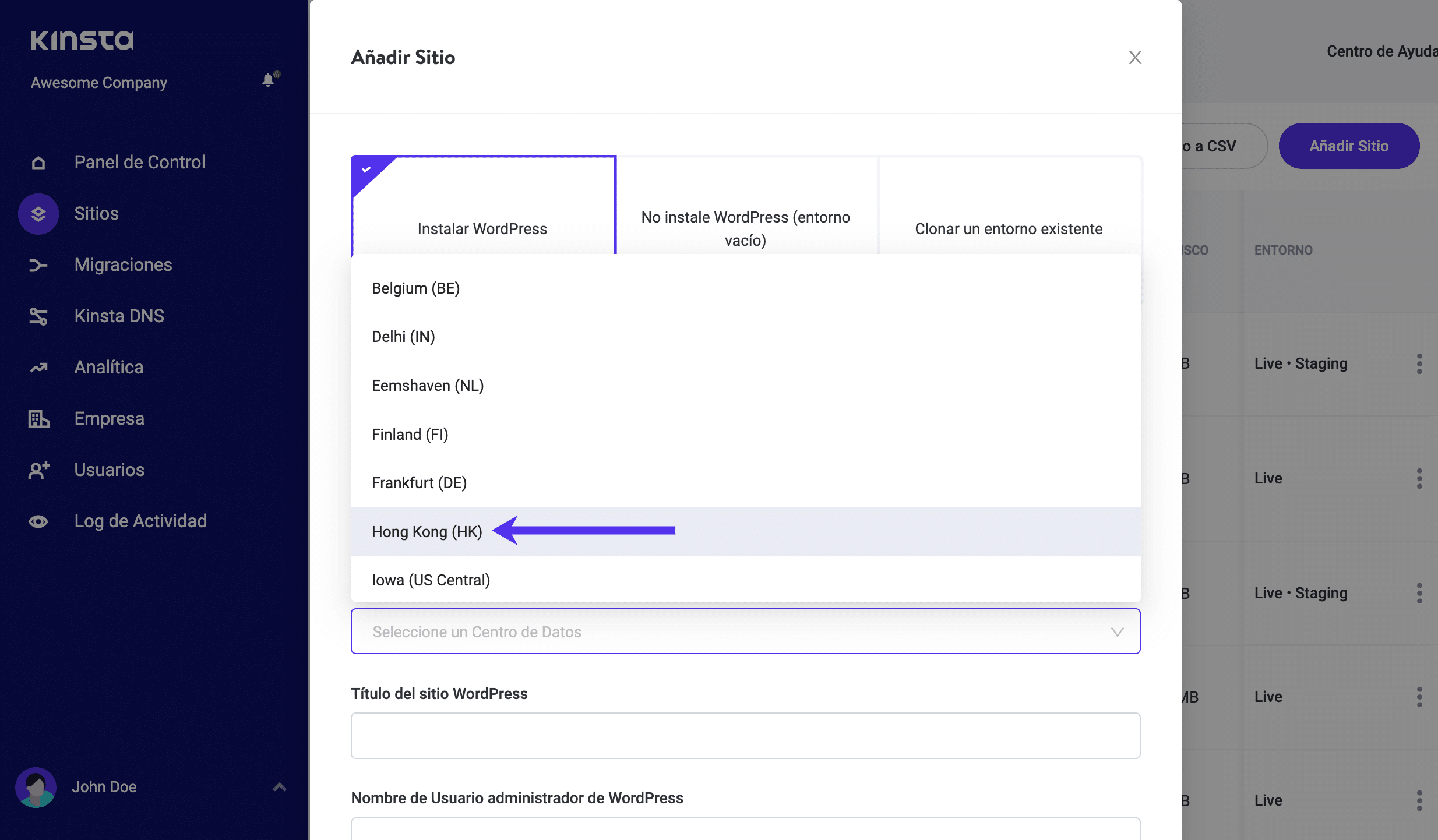 Esta nueva ubicación ahora está disponible desde el panel de MyKinsta al agregar un sitio: Hong Kong (HK).