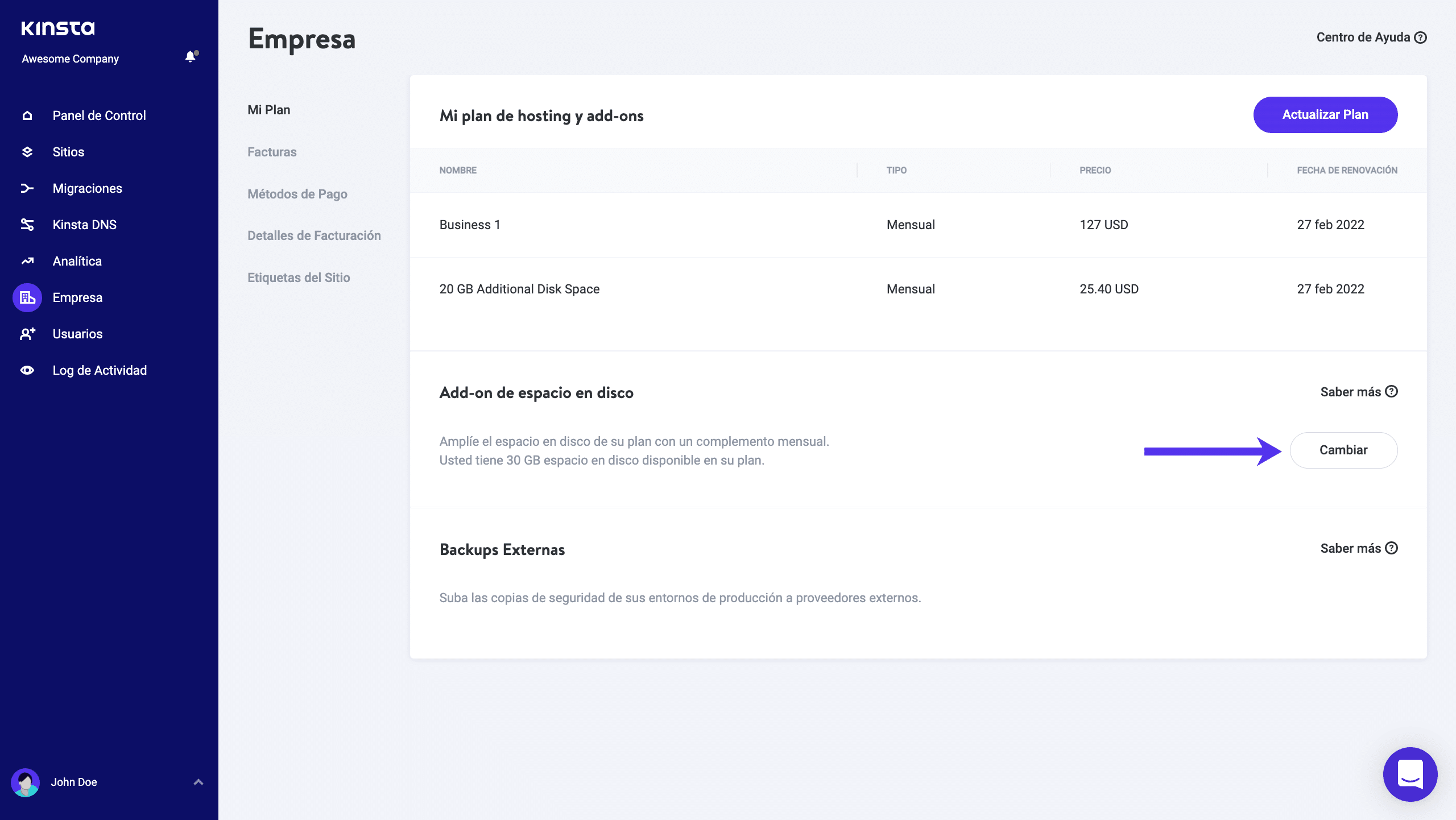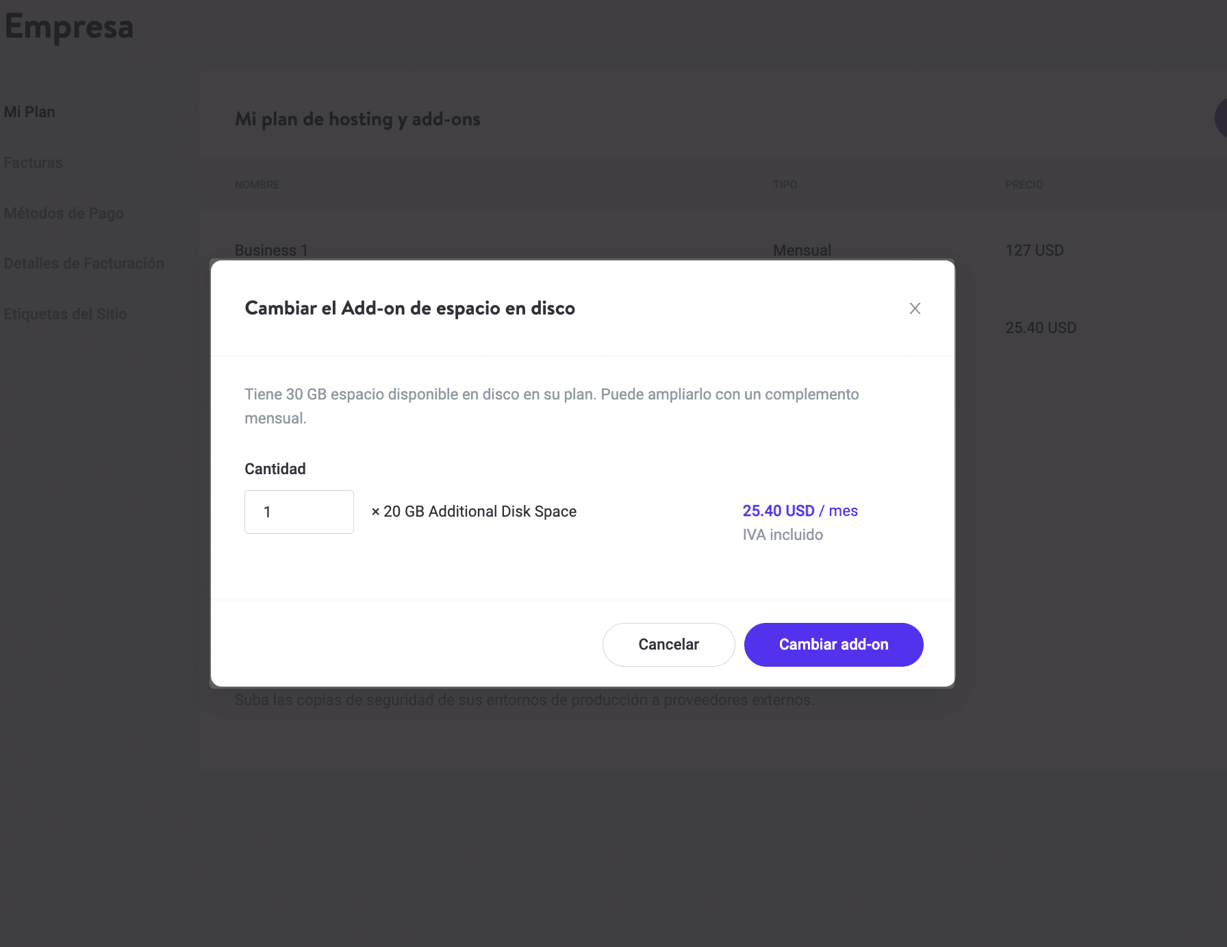 Puede encontrar esto en «Facturación» en la pestaña «Mi Plan». Dentro de la sección «Ampliación del espacio en disco», haga clic en «Añadir al plan».