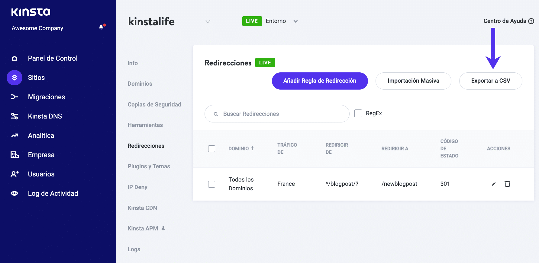 Somos concientes que algunos de ustedes tienen cientos o hasta miles de redirecciones. La habilidad de exportación permite la editación offline y la reimportación con facilidad, así como capacidad de transferir sus redirecciones a una herramienta o servicio diferente. Ahora encontrará la opción «Exportar a CSV» en la herramienta de redirecciones.