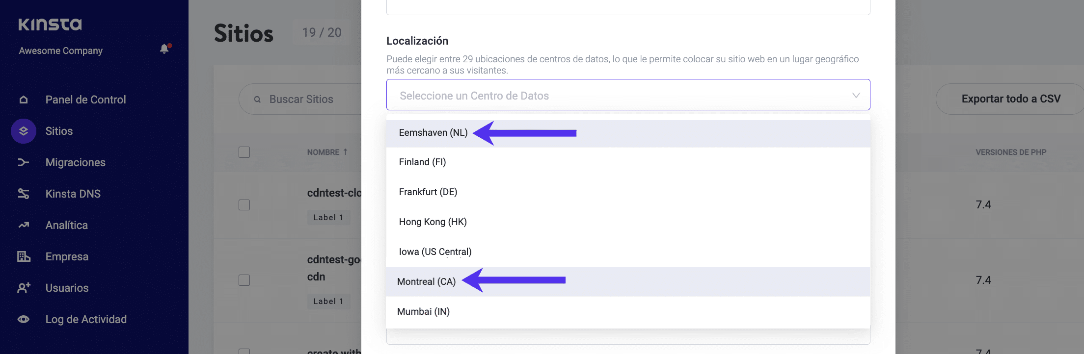 Ambas ubicaciones nuevas ya son disponibles en su panel de control MyKinsta al «Añadir un sitio nuevo».