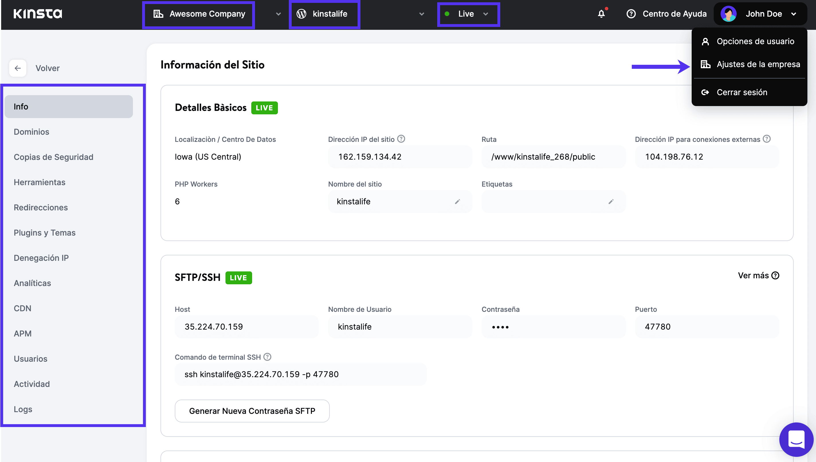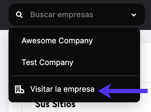 Lista desplegable de empresas, que muestra una lista de todas las empresas a las que tienes acceso y un práctico enlace a Visitar Empresa para saltar directamente a la página de configuración de tu empresa.