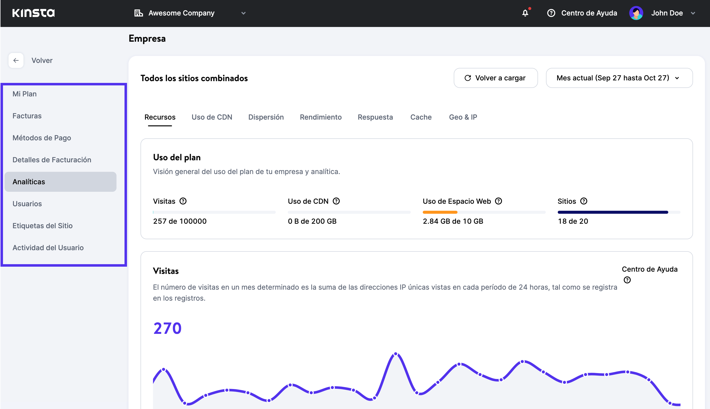 Aquí puedes gestionar cosas a nivel de empresa, como el acceso de los usuarios, la actividad de los usuarios, la información de facturación y pago, las etiquetas de los sitios y los análisis agregados de todos tus sitios: