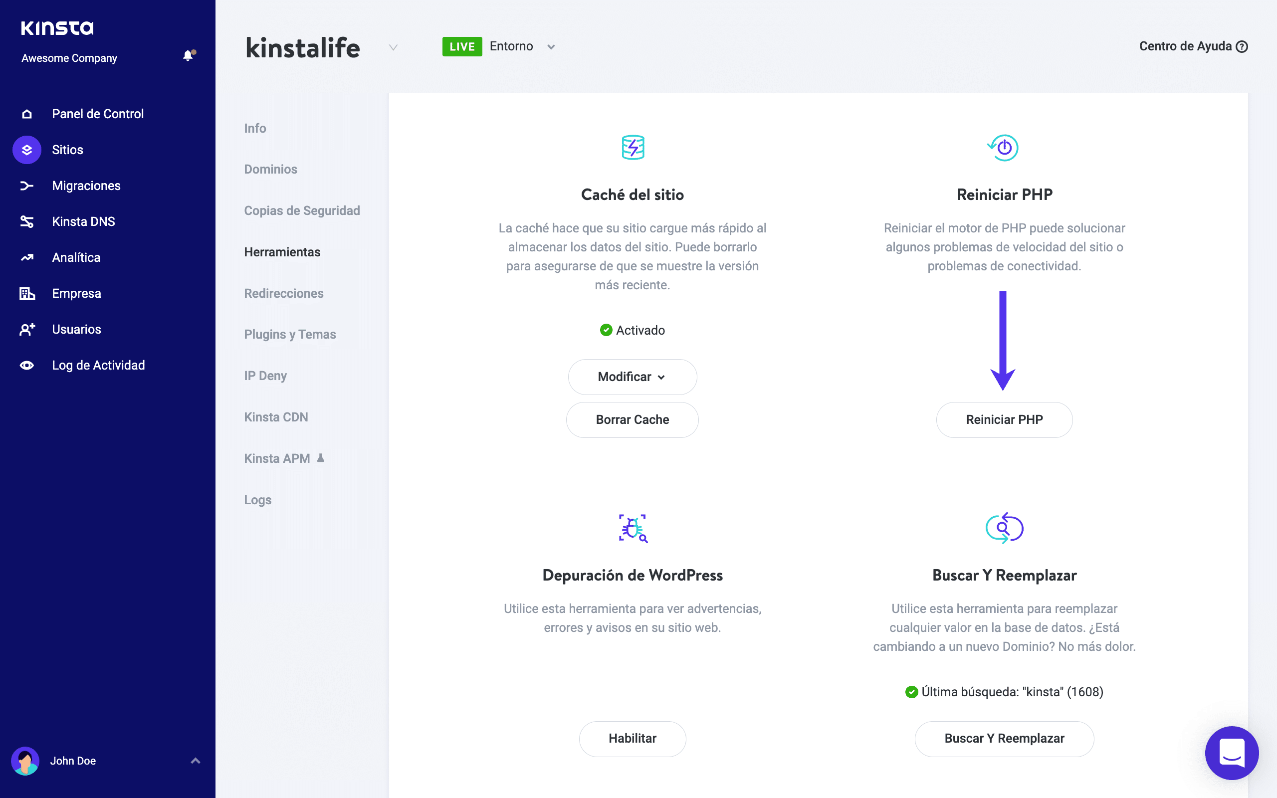 Si aún no lo sabía, hemos tenido una herramienta en el dashboard de MyKinsta durante bastante tiempo que le permite reiniciar PHP con un solo clic (como se ve a continuación). Aunque esto es definitivamente útil, todavía no es perfecto. ¿Por qué? Uno, sigue siendo un proceso manual. Dos, si PHP ha fallado, ¿cómo se supone que lo sabe? Así que decidimos llevar esto un paso más allá.