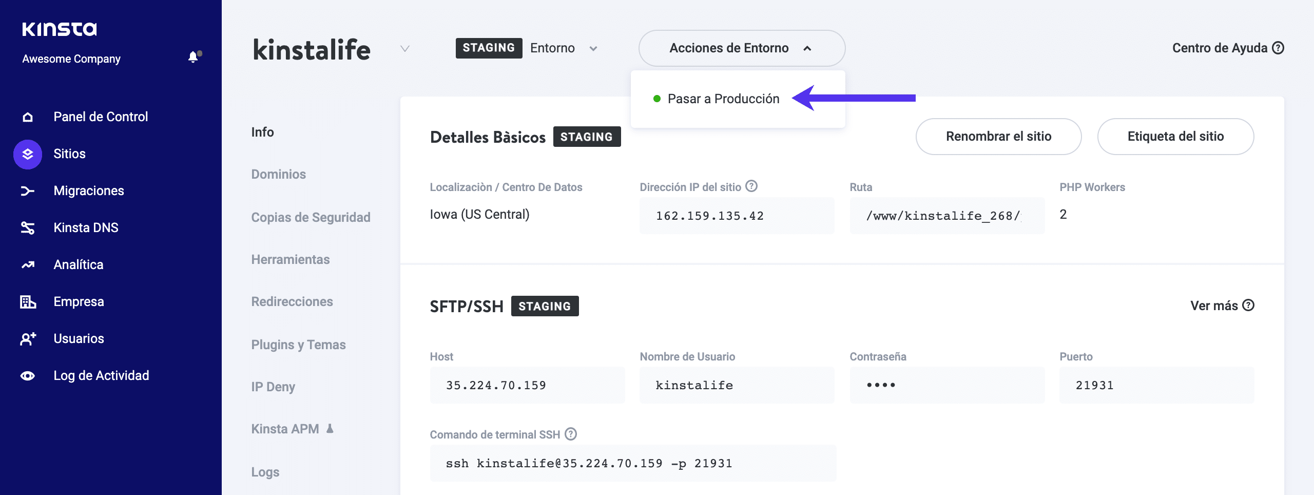 Desde allí, selecciona el sitio staging que quieres enviar a vivo y haz clic en el botón Enviar staging a Vivo.