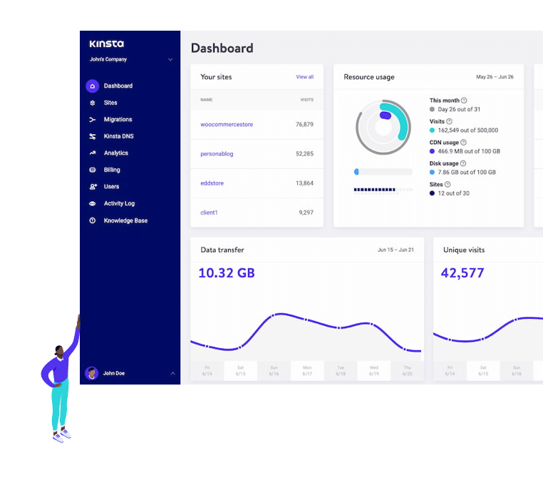 El panel de control de MyKinsta te permite gestionar fácilmente todos tus sitios web en un solo lugar. Lo hemos construido específicamente para WordPress, por lo que encontrarás funciones y herramientas específicas para WordPress.