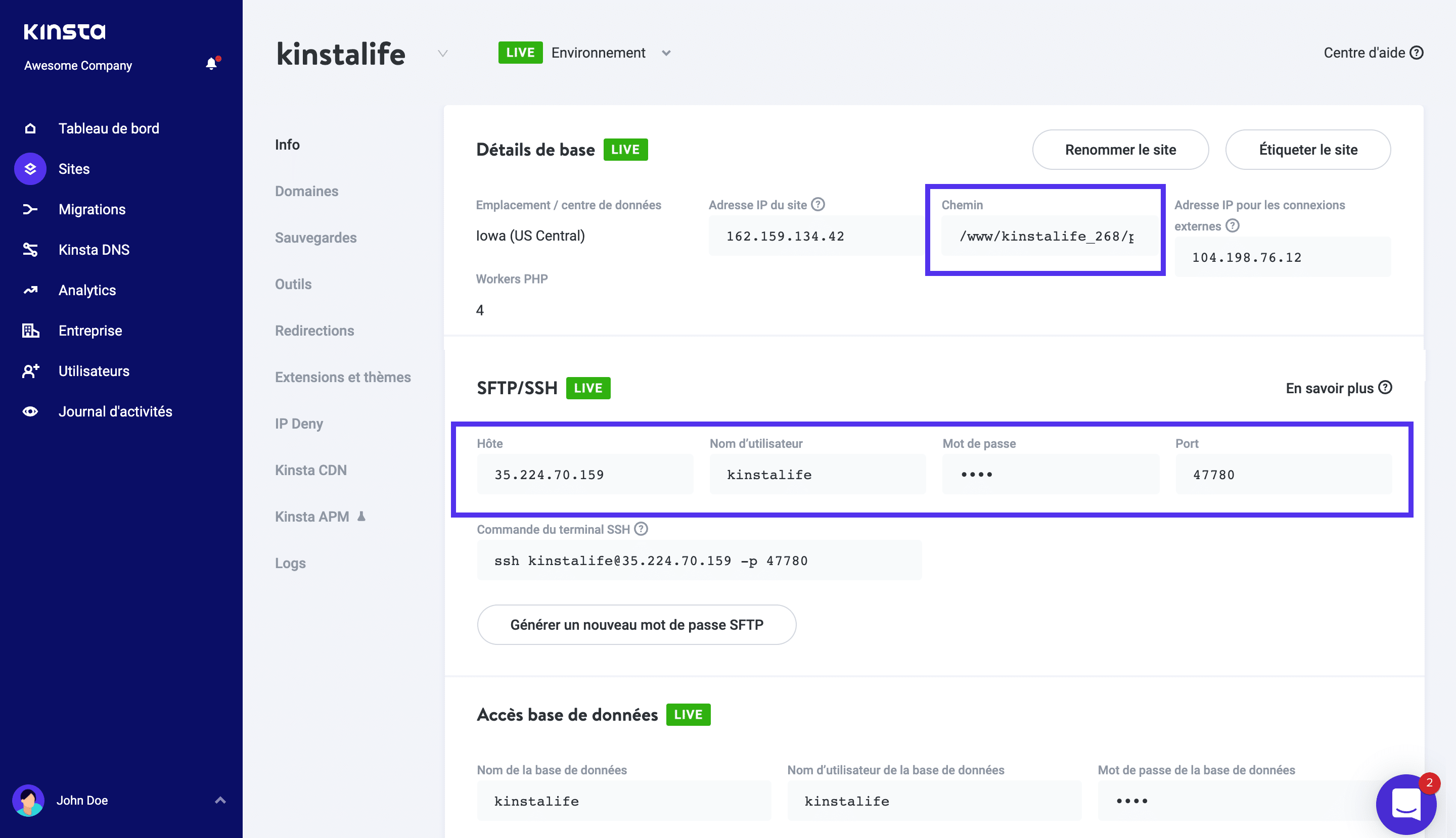 Votre hébergeur devrait vous fournir les informations ci-dessus. Généralement, cela se trouve dans votre tableau de bord ou dans un courriel. Kinsta fournit ces informations aux clients dans le tableau de bord sous la section Sites/Info.
