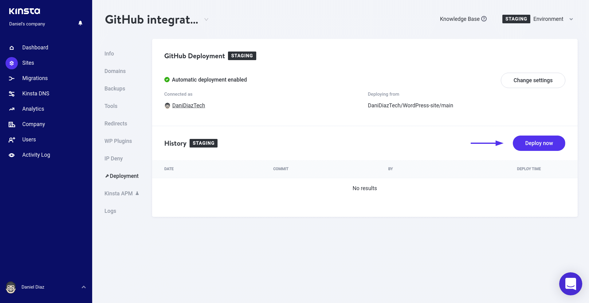 Une fois que vous êtes dans votre site de staging, allez dans l’onglet Déploiement et cliquez sur le bouton Commencer la configuration. Vous allez voir une modale GitHub qui va permettre à Kinsta de se connecter à votre compte GitHub.