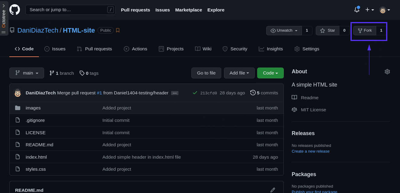 Dans ce guide, vous allez créer un site HTML simple. Pour des raisons pratiques, vous allez forker le projet de base du dépôt du site HTML vers votre compte GitHub. Ceci peut être fait pour tous les dépôts publics disponibles.