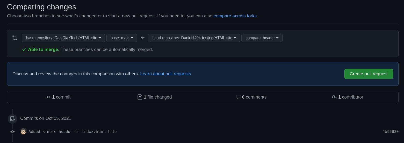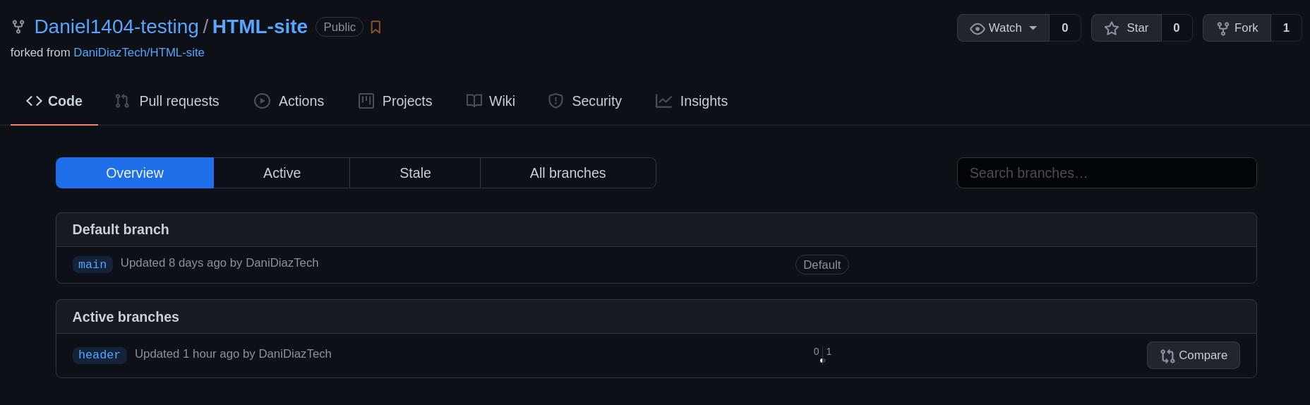 Après cela, vous devriez être en mesure de voir une nouvelle branche nommée header dans votre dépôt forké (par exemple https://github.com/yourusername/HTML-site/branches) :