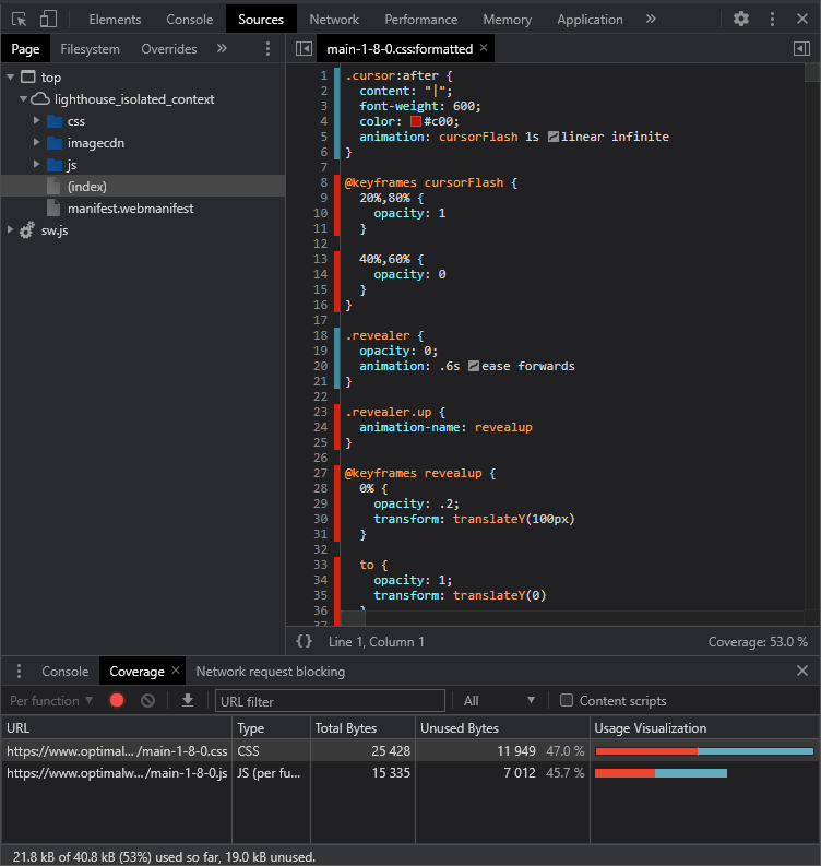Les ressources CSS et JavaScript sont affichées dans le panneau Couverture , avec la proportion de code inutilisé en rouge. Cliquez sur n’importe quel fichier pour afficher sa source, le code inutilisé étant mis en évidence en rouge dans la gouttière du numéro de ligne.