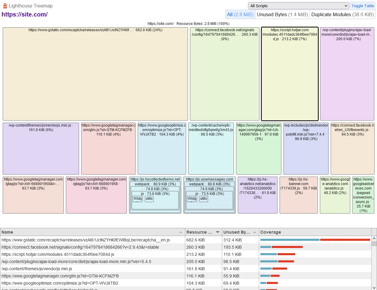 Par exemple, un treemap montre les ressources JavaScript les plus importants avec une mesure de couverture, qui indique quelle proportion de code est utilisée et non utilisée :
