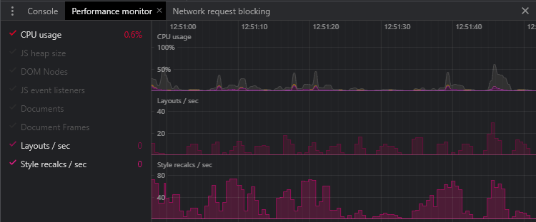 Les navigateurs basés sur Chromium disposent d’un moniteur de performance en temps réel. Là encore, il est disponible dans le menu DevTools Plus d’outils. Les graphiques se mettent à jour lorsque vous naviguez dans les pages, que vous faîtes défiler les pages et que vous déclenchez des animations :