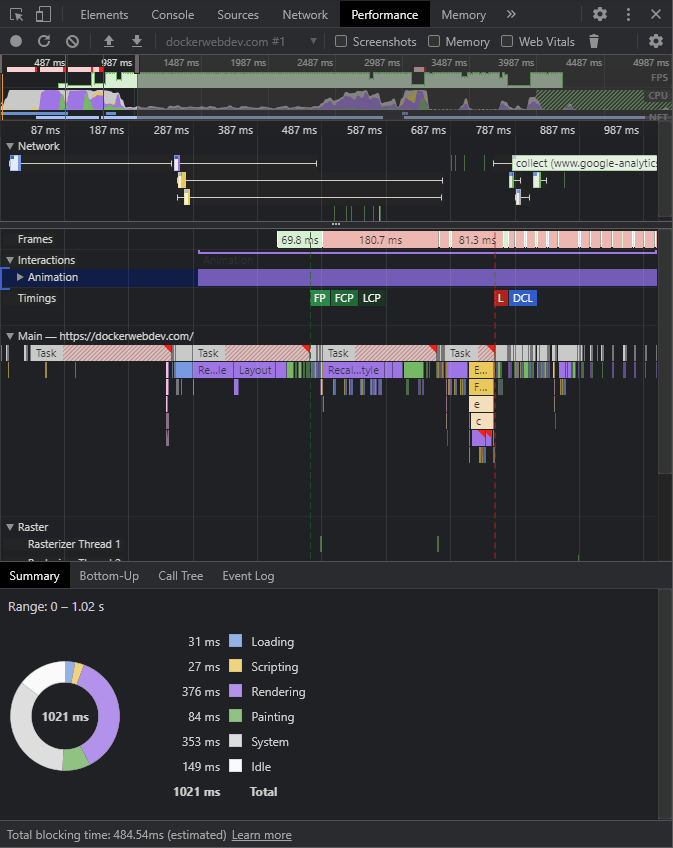 • Barre rouge supérieure : Cela indique que le taux de frame a considérablement baissé, ce qui peut causer des problèmes de performance. Cela est normal au début du chargement d’une page, mais des animations CSS excessives peuvent aussi être un problème.