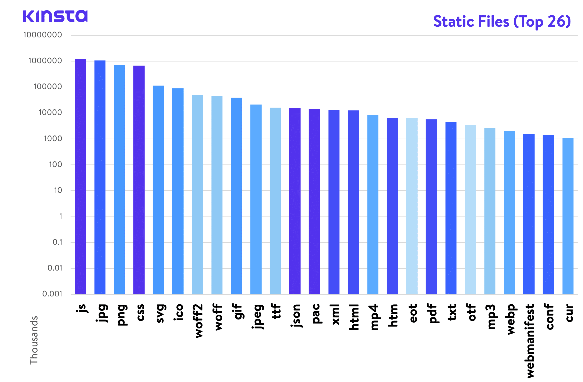 I file JavaScript (.js) sono il tipo di file più richiesto dai siti ospitati su Kinsta. Mentre la maggior parte di questi risultati non sono stati troppo sorprendenti, è stato interessante vedere come .webp ha superato .jpg .jpeg con oltre 1 miliardo di richieste mentre il secondo è andato a nord di soli 21 milioni (leggi perché qui: jpg vs jpeg). Kinsta supporta WebP e avremo presto qualche informazione in più su questo tipo di file! ?
