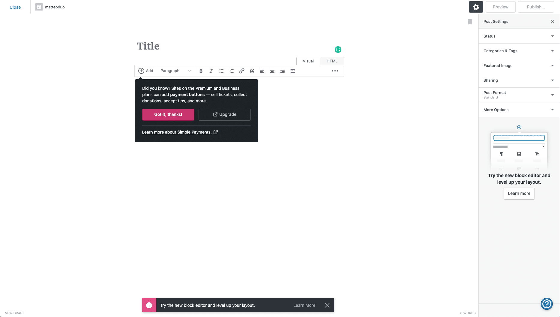 L’esperienza è un po’ insoddisfacente: WordPress self-hosted dispone di plugin per la creazione di pagine che offrono un design e un’usabilità uguali se non migliori.