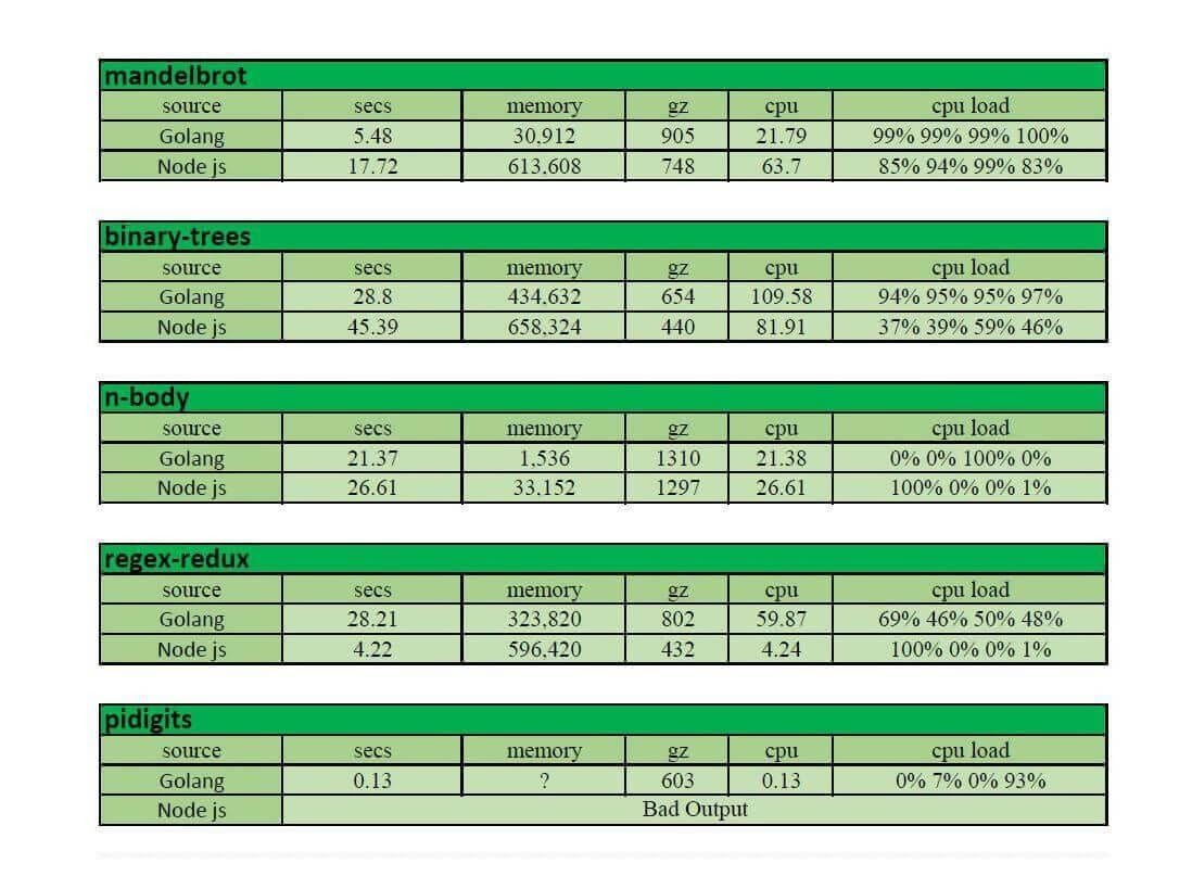 Di seguito, vedremo un esempio che mostra le prestazioni delle operazioni di benchmark di Node.js e di Go per diversi metodi e algoritmi del linguaggio informatico.