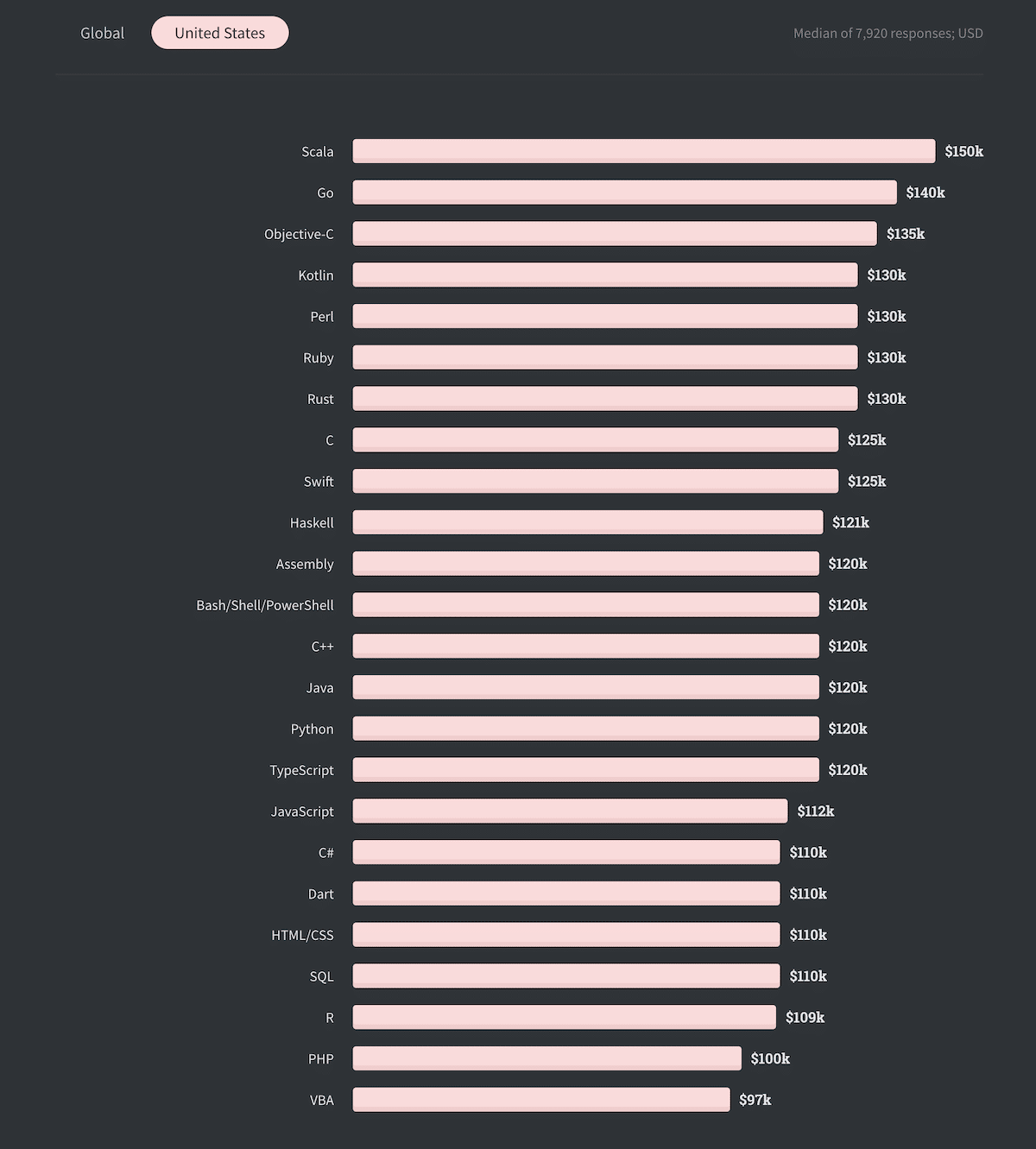 In termini di stipendi per il lavoro con queste tecnologie, diamo un’occhiata al sondaggio Stackoverflow Survey 2020.