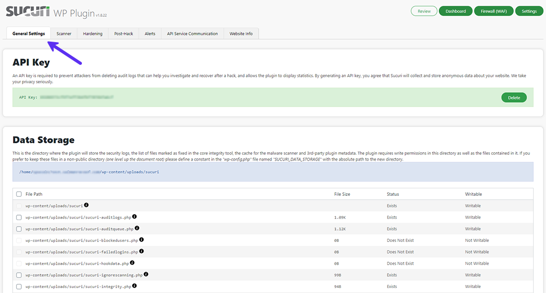 Il pannello Settings presenta molte schede per personalizzare il modo in cui Sucuri proteggerà il vostro sito web. Nella scheda General Settings troverete la chiave API, le directory di Data Storage e altre impostazioni come Log Exporter, Reverse Proxy, IP Address Discoverer e Timezone Override.