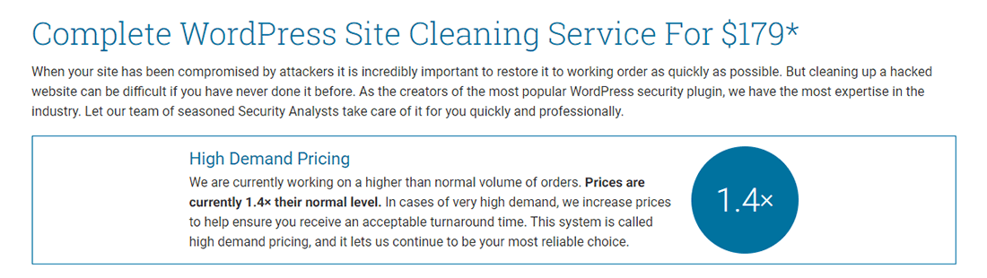 Rispetto al servizio di rimozione del malware e di pulizia degli hack di Sucuri, che è incluso nella piattaforma premium di Sucuri, il servizio di pulizia del sito di Wordfence sembra più costoso.