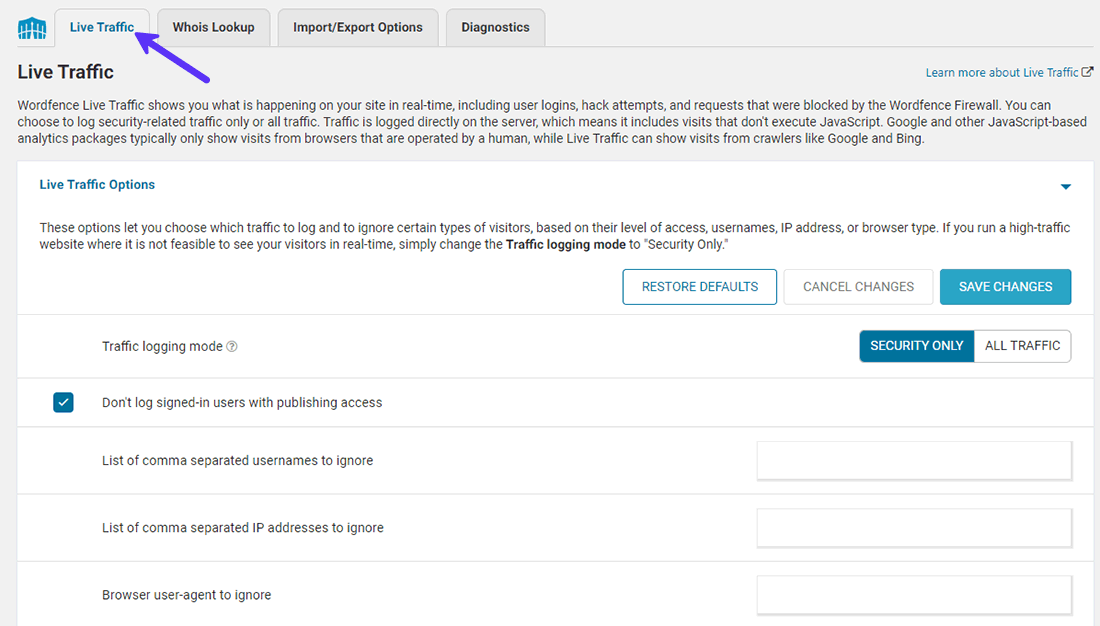 Lo strumento Live Traffic vi aiuta a vedere cosa succede sul vostro sito web in tempo reale. È possibile creare un filtro solo in base al traffico legato alla sicurezza. Questo vi mostrerà tutti i login degli utenti, i tentativi di hackeraggio e le richieste dannose.