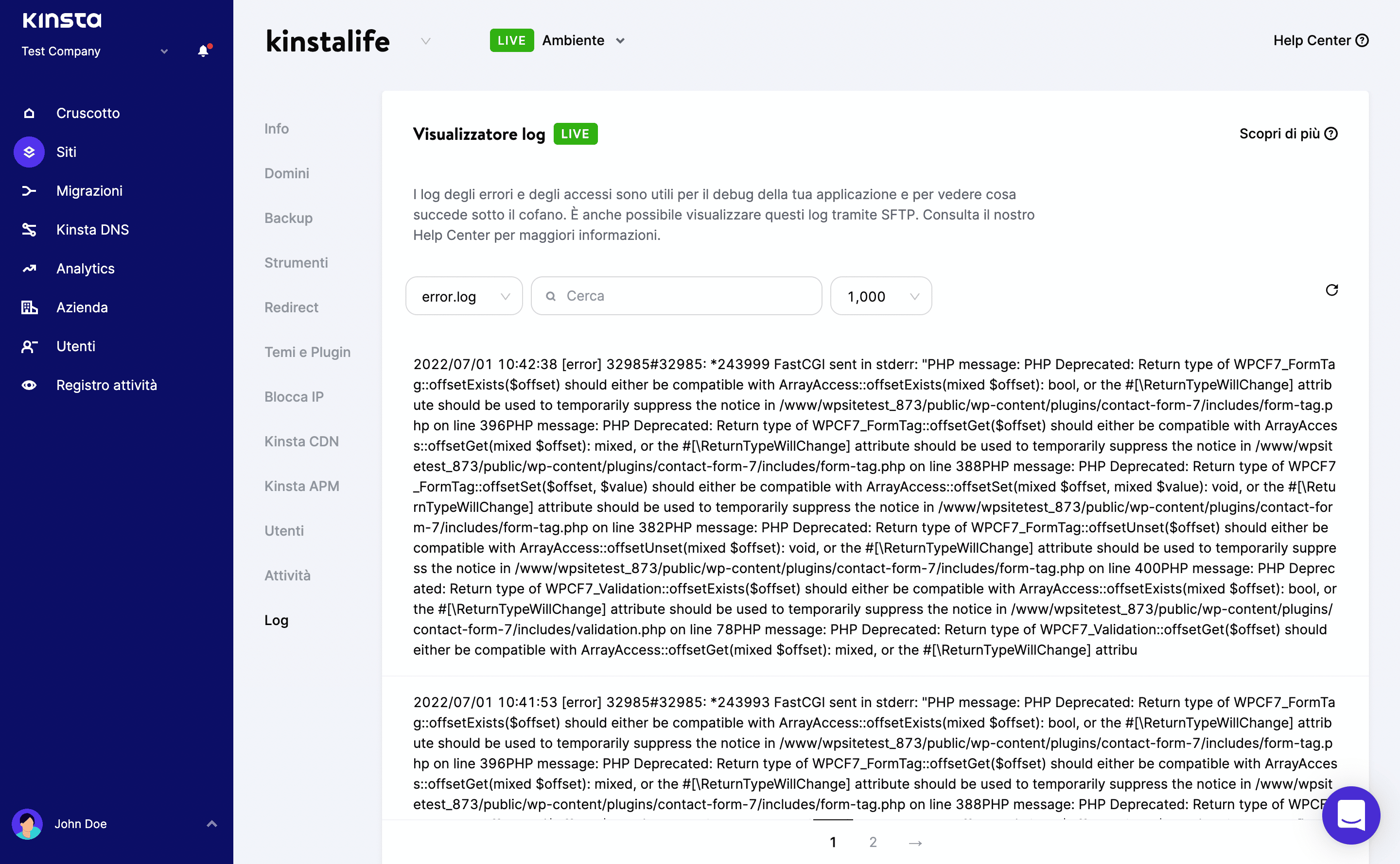 Importante: se WP_DEBUG è abilitato nell’ambiente di Kinsta, tutti gli errori saranno indirizzati al file debug.log e nulla sarà indirizzato al file error.log nel cruscotto di MyKinsta.