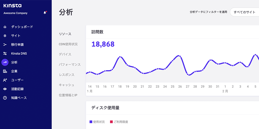 分析のすべてのログデータが30日間保持されます。プランの訪問数を超えることを心配している方には、Kinstaに移行した直後に、ダッシュボードの分析セクションを頻繁に確認することをお勧めします。 原因不明のトラフィックスパイクまたはいつもと違うデータが発生した際に、ログを調査し、原因を特定いたしますので、当社のチームにお知らせください。