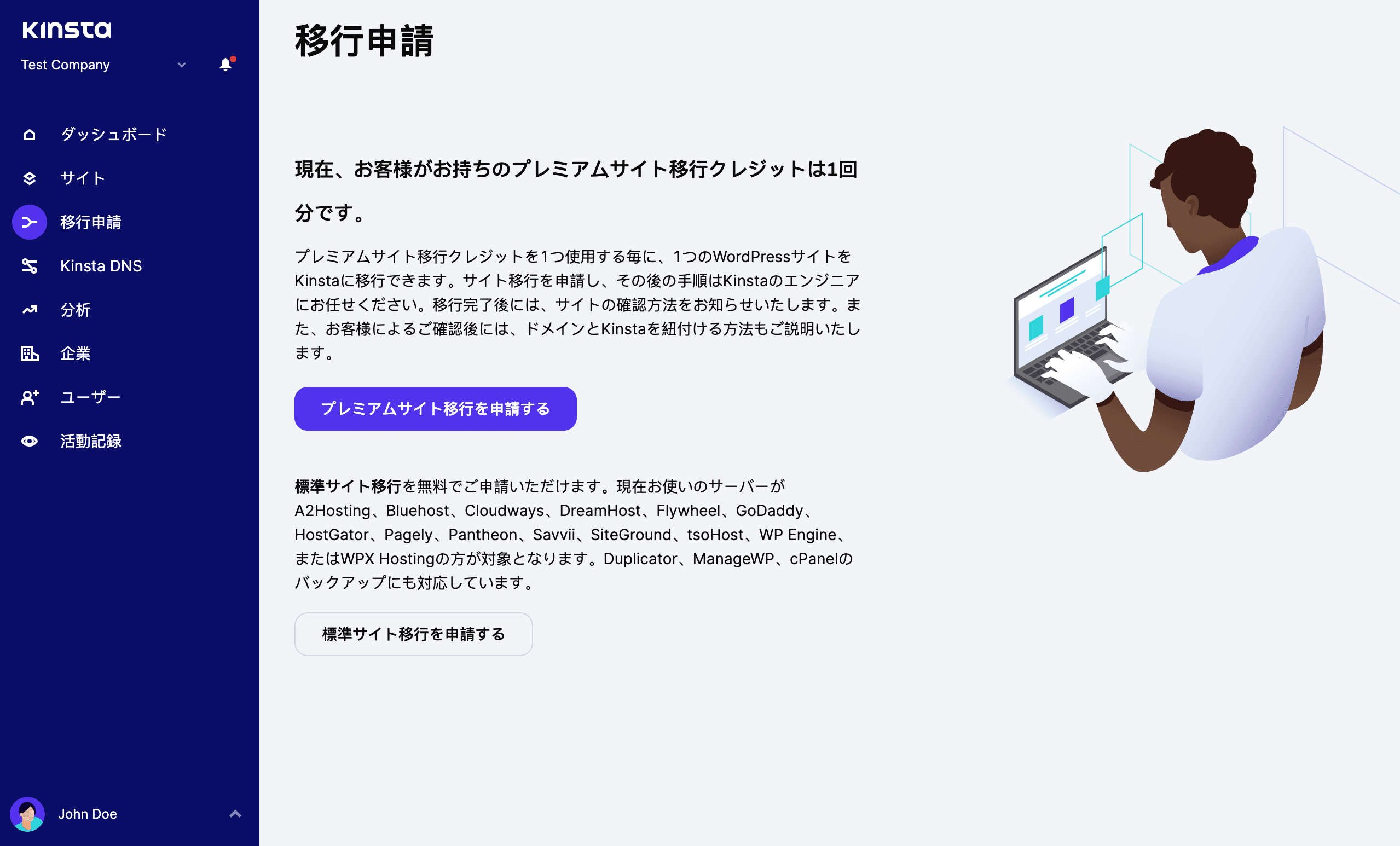 サインアップ後、MyKinstaからサイト移行を申請することができます。その後、担当者より、サイト情報やスケジュールについて、ご連絡差し上げます。移行開始後は、各ステップにおいて進捗が通知されます。これについては、MyKinstaにて、ご自身でご確認いただくことも可能です。