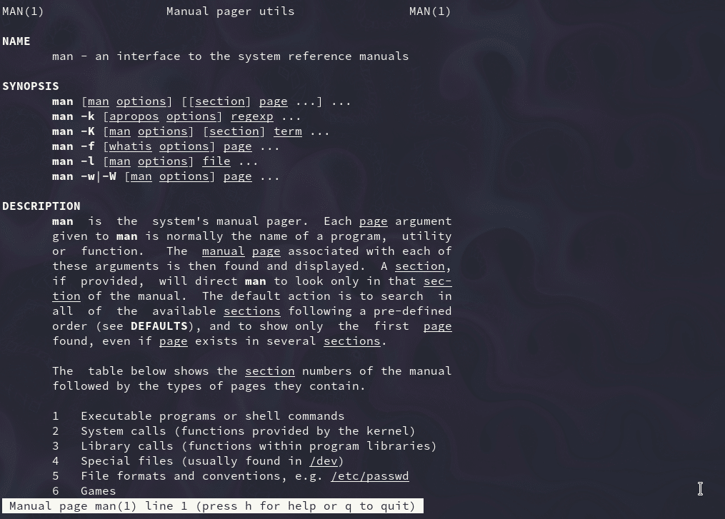 Een andere belangrijke Linux opdracht is man. Hierdoor krijg je de pagina in de handleiding (manual) van een opdracht te zien, als die bestaat.