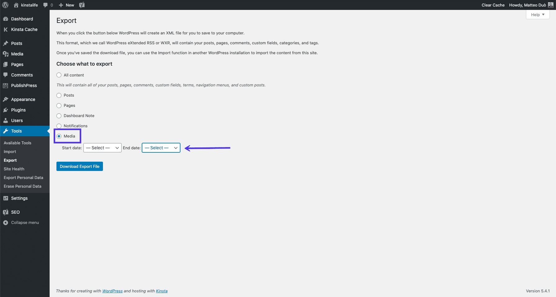 In sommige gevallen is het nodig om bestanden uit je mediabibliotheek naar je computer te downloaden. WordPress heeft hier een ingebouwde functie voor. Je kan deze openen via Gereedschap > Exporteren:
