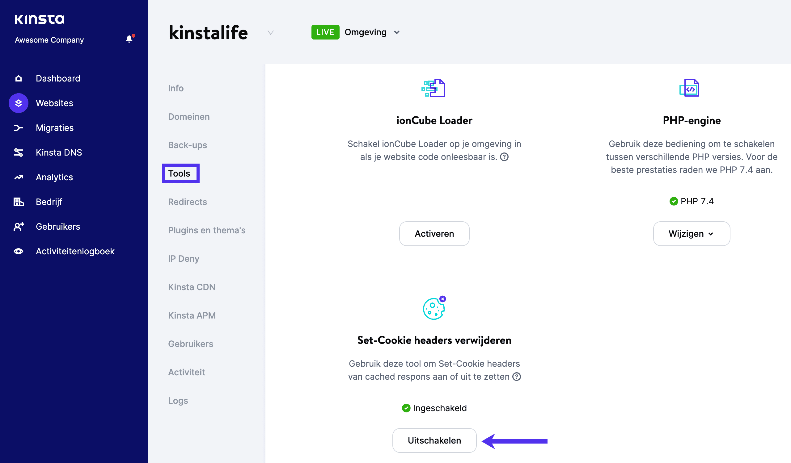 - Navigeer naar Websites > sitenaam > Tools > Set-Cookie headers verwijderen.