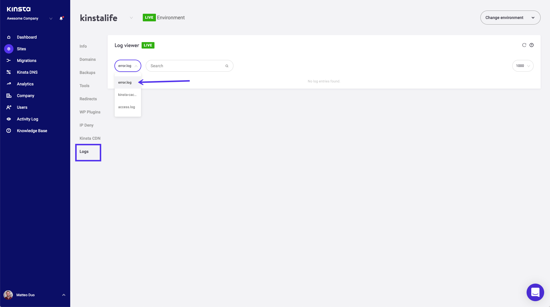 Clique no nome do site que está com o erro na lista resultante. Depois navegue até Logs e selecione error.log a partir do menu suspenso: