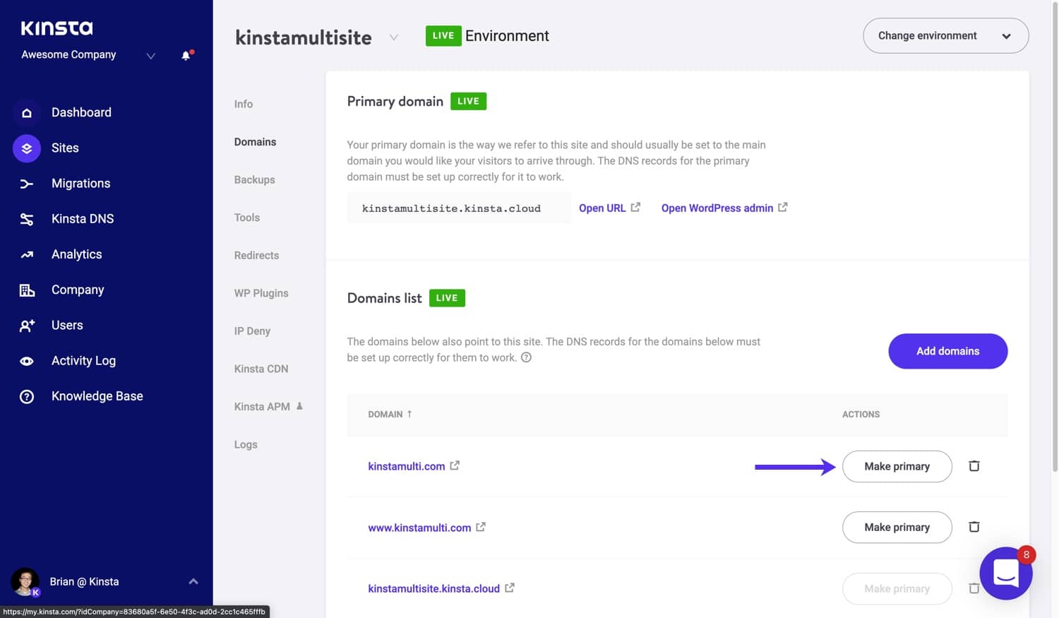 Finalmente, após adicionar seus registros DNS, clique em “Tornar primário” ao lado do nome de domínio do seu site principal no MyKinsta para trocar o domínio principal do seu site.