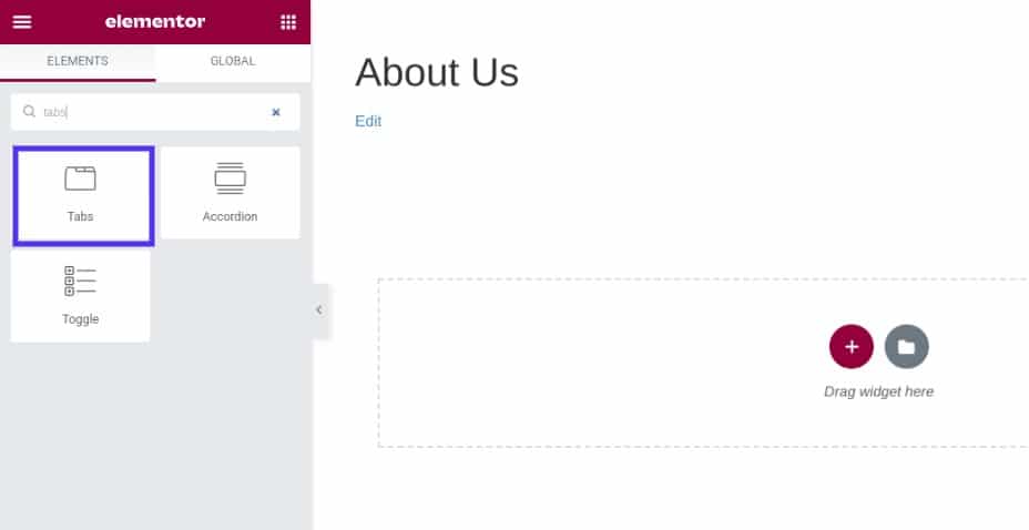 Isto irá lançar a interface do editor do Elementor. No painel do lado esquerdo, sob Elements, procure e selecione o widget Tabs :