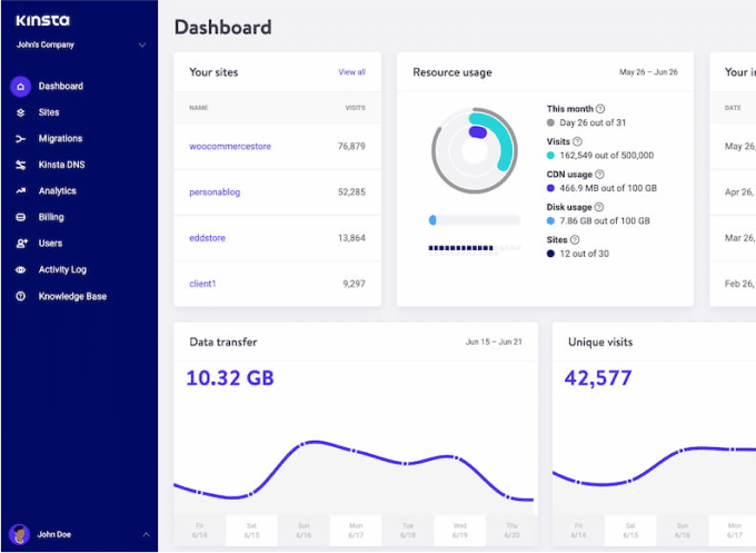 We weren’t satisfied with the existing control panels out there so we built our own dashboard specifically for WordPress. MyKinsta is designed for inexperienced users and developers alike. Manage your website, view analytics, collaborate with your team, configure for speed and security, access live chat support, and more.